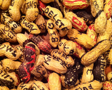 The peanuts have served as a canvas for love notes, poetry, and anarchy over the course of several months. The first peanut offering was secretly installed as a count of breaking and entering into the Dwertman’s apartment. After three weeks The Leopards did not want them to have it anymore and they took it back.